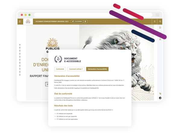 Conformément au décret de loi 2019-768 et à l’EAA (European Accessibility Act), PubliSpeak™ vous aide à respecter des normes telles que WCAG 2.2, RGAA 4.1, et d’autres standards mondiaux, garantissant que vos publications soient accessibles à tous, y compris aux personnes en situation de handicap.